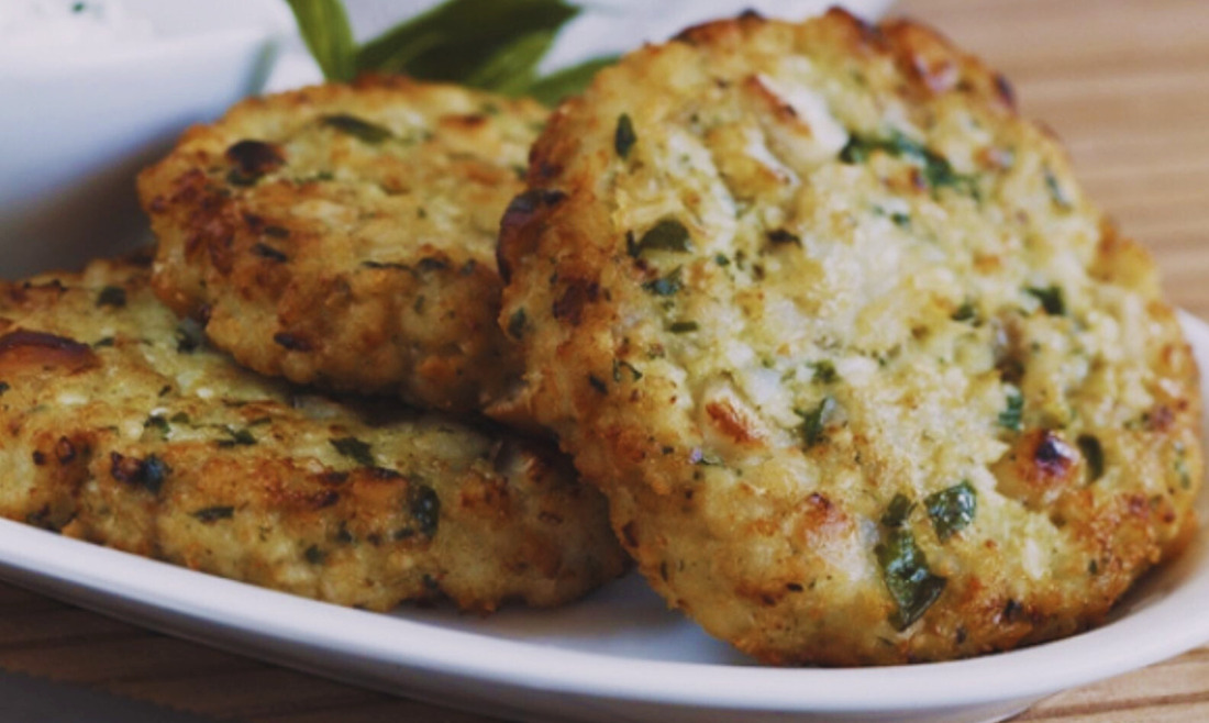 マカダミア入りエビと白身魚のすり身焼き、ミントヨーグルトソース