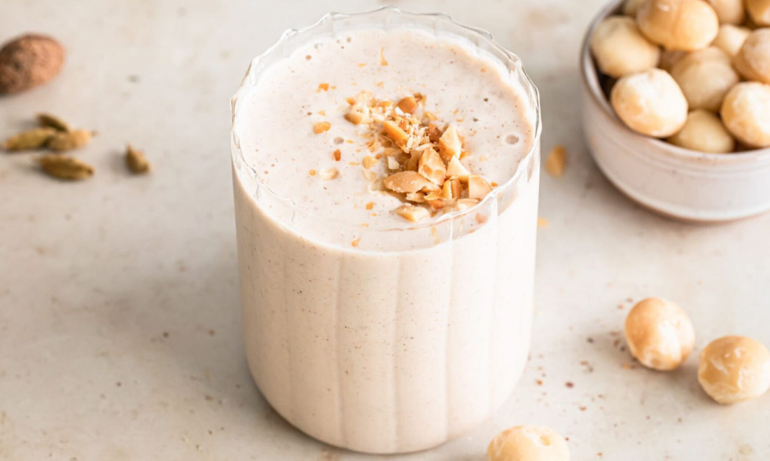 マカダミアバターにバナナ、ギリシャヨーグルト、ハチミツを加えてブレンドすれば、朝食や運動後にぴったりのクリーミーで栄養満点なスムージーが完成します。