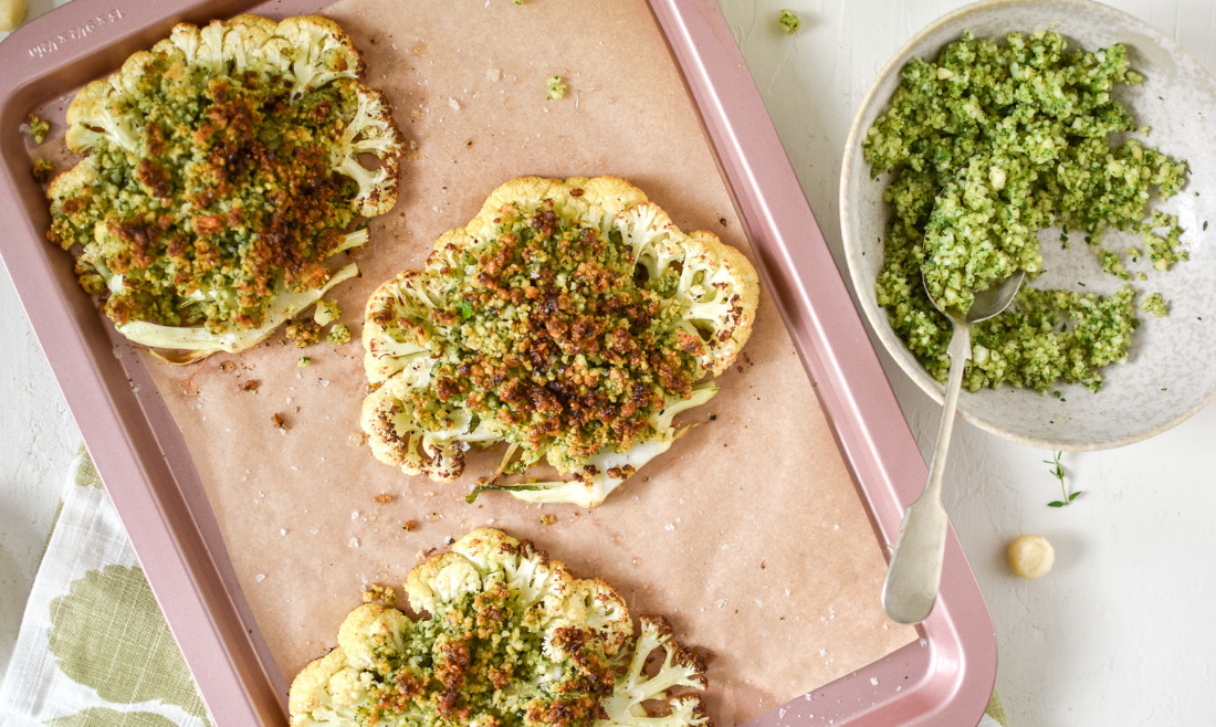 - クッキングシートを敷いた天板にスライスしたカリフラワーを並べ、残りのマカダミアオイルを回しかける。カリフラワー全体に塩・コショウでしっかりと味をつけたら、ハーブ&ガーリックのクラムをたっぷりとのせる。