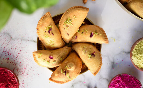 グジヤは、ミルクやナッツのフィリングが詰まったサクサクの揚げ菓子で、インドではお...